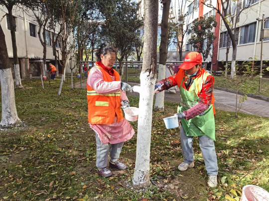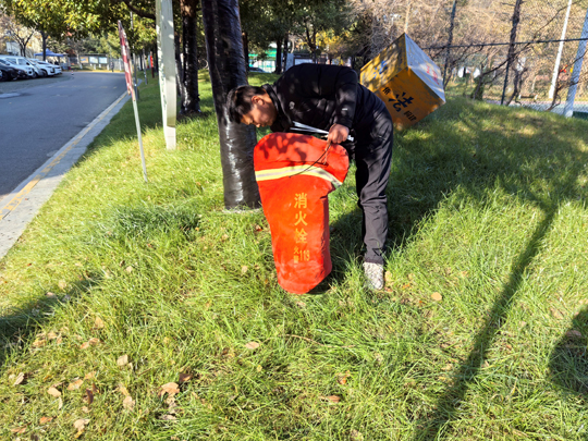 細心的業(yè)主不難發(fā)現(xiàn),樹木已悄然穿上整齊的“冬裝”。物業(yè)工作人員有條不紊地對喬木根部進行涂白處理。這層白色“防護衣”不僅美觀,更是樹木越冬的“守護者”——它能有效反射部分陽光,減緩樹干因晝夜溫差過大而導致的凍裂風險,同時清除樹皮縫隙中潛藏的害蟲及蟲卵,為來年春季樹木茁壯成長打下堅實基礎(chǔ)。