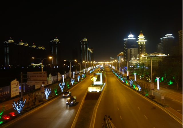 每到夜晚,安裝在建筑物房檐、屋頂、翹角、綠化、水面、景觀點等位置的燈光帶同時亮起,將青海湖西路的輪廓勾勒得鮮明清晰,道路、水面、公園、綠化等景觀也被一一點亮,更加絢麗多姿,托出繁華熱鬧的氛圍。